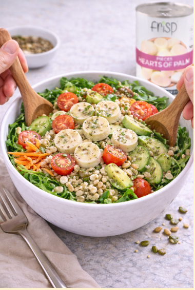In a large bowl, layer spinach and quinoa as the base. Add Frisp Hearts of Palm, avocado, cucumber, carrots, walnuts, chia seeds, flaxseeds, and pumpkin seeds.