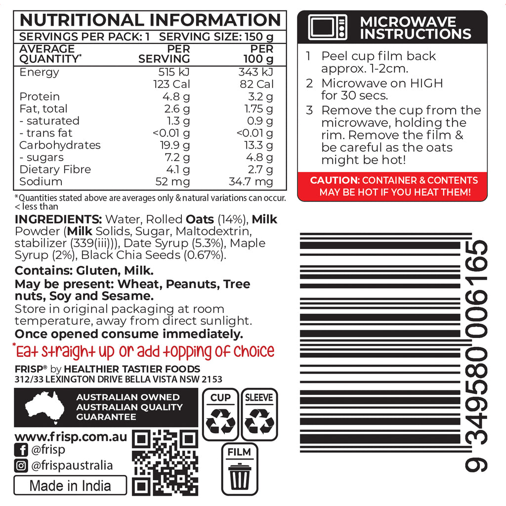 Frisp Ready to Eat Oats -Maple Date Chia is a wholesome and convenient meal made with milk, perfect for quick breakfasts, office snacks, or on-the-go fuel. This nourishing blend features creamy oats combined with naturally sweet maple and chewy dates, enhanced with the goodness of chia seeds for added texture and nutrition. Each 150g serving comes pre-prepared, so you can enjoy it instantly—no cooking or heating required.